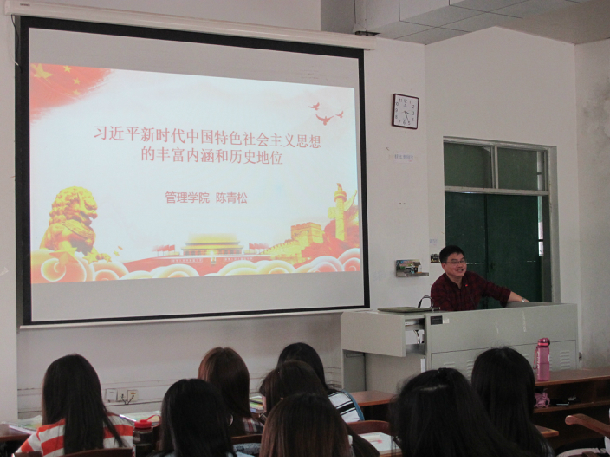 陳青松副教授為學生作了題為《習近平新時代中國特色社會主義思想的豐富內涵和歷史地位》的講課。首先闡述了習近平新時代中國特色社會主義思想產生的社會背景。隨后講解了習近平新時代中國特色社會主義思想的豐富內容,重點介紹了新時代中國特色社會主義思想中的“八大明確”和基本方略。最后闡明了習近平新時代中國特色社會主義思想歷史地位,一是在理論上實現了馬克思主義中國化的新飛躍;二是在實踐上形成了治國理政的總體框架;三是在話語體系上構建中國特色哲學社會科學新話語;四是在文化上為解決人類問題貢獻了中華新文明。