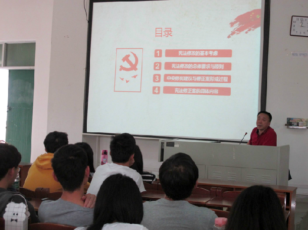 寧凌教授為學生作了題為《國家< 憲法>修訂情況宣講》的講課。寧凌教授首先向學生介紹了自己作為人大代表履職的經歷,闡述了人大代表的職責,分享了自己參加全國人民代表大會的體會,特別是國家主席習近平進行憲法宣誓的感動瞬間。坦言作為人大代表是幸運的、幸福的,也是感恩的。然后,寧凌教授對國家《憲法》修訂情況進行宣講。詳細講解了憲法修改的基本考慮、憲法修改的總體要求與原則、中央修憲建議與修正案形成過程、憲法修正案的具體內容,指出《憲法》修訂把黨的指導思想轉化為國家指導思想,是黨和國家事業發展的迫切需要,也是我國憲法完善發展的內在要求;《憲法》修訂進一步明確堅持黨對一切工作的領導這一最高政治原則,有利于鞏固黨的執政地位和執政基礎、為國家發展和民族振興提供堅強政治保證。