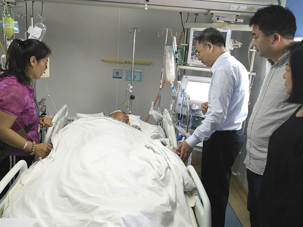 彭權(quán)群向主治醫(yī)生詳細(xì)了解曹震同學(xué)的病情及恢復(fù)情況,向醫(yī)院醫(yī)生和有關(guān)領(lǐng)導(dǎo)轉(zhuǎn)達(dá)學(xué)校對醫(yī)院全力以赴救治學(xué)生的感謝,向家長轉(zhuǎn)達(dá)各位領(lǐng)導(dǎo)的關(guān)懷和老師同學(xué)們的問候。隨后關(guān)切地來到曹震同學(xué)病床前,代表學(xué)校送上學(xué)生臨時困難補(bǔ)助和愛心慰問金,鼓勵他要與疾病頑強(qiáng)斗爭,爭取早日康復(fù),早日返回校園!曹震同學(xué)雖然不能言語,但透過他的輕微點(diǎn)頭示意,看到了他對生命的渴望和對大家的深深感激之情。最后,曹震的母親代表全家感謝學(xué)校領(lǐng)導(dǎo)、老師和同學(xué)們的關(guān)心和幫助。