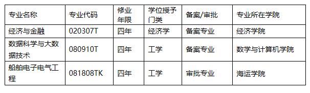 近日,教育部下達《教育部關于公布2019年度普通高等學校本科專業備案和審批結果的通知》(教高函〔2020〕2號),我校組織申報的經濟與金融、數據科學與大數據技術、船舶電子電氣工程等3個新專業全部獲準設立,其中2個備案專業,1個審批專業(具體名單見附表)。至此,我校本科專業數達到80個。