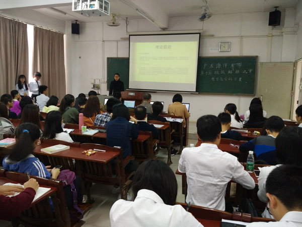 3月12日上午,我校在湖光校區鐘海樓課室舉行學校第十屆“挑戰杯”大學生課外學術科技作品競賽終審答辯,51支入圍團隊參與角逐。科技處副處長白福臣出席活動并擔任評委。校團委書記尹喜、副書記袁仁廣、入圍團隊成員和眾多學科競賽愛好者到現場觀看了比賽。