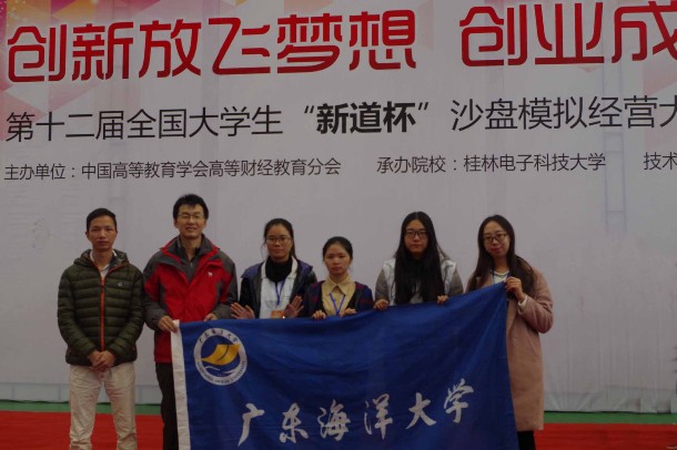 11月27日,“第十二屆全國大學生創業沙盤模擬經營大賽全國總決賽”在桂林電子科技大學落下帷幕。在校領導的關懷下、校團委的大力支持下、以及在管理學院的積極組織下,由孟飛榮老師和李婉婷、鄭智熙、陳柯柯、劉秋意、伍芷珊同學等我校參賽隊伍代表廣東省參賽,并獲得本科組三賽區第一名的佳績。
