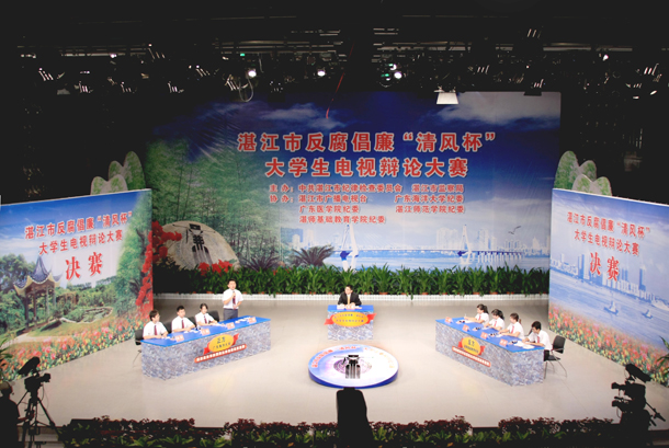 本次辯論賽是由中共湛江市紀律檢查委員會主辦,市廣播電視臺、廣東海洋大學紀委、廣東醫(yī)學院紀委、湛江師范學院紀委和湛師基礎(chǔ)教育學院紀委聯(lián)合協(xié)辦的湛江市反腐倡廉“清風杯”大學生電視辯論大賽決賽。省紀委宣教室主任凌曲剛、市委領(lǐng)導四套管理班子出席了大賽,我校黨委副書記、紀委書記容景春,校黨委副書記潘泰,校紀委副處長林偉、宣傳部副部長夏曉明、團委副書記鄭一鳴等出席大賽。