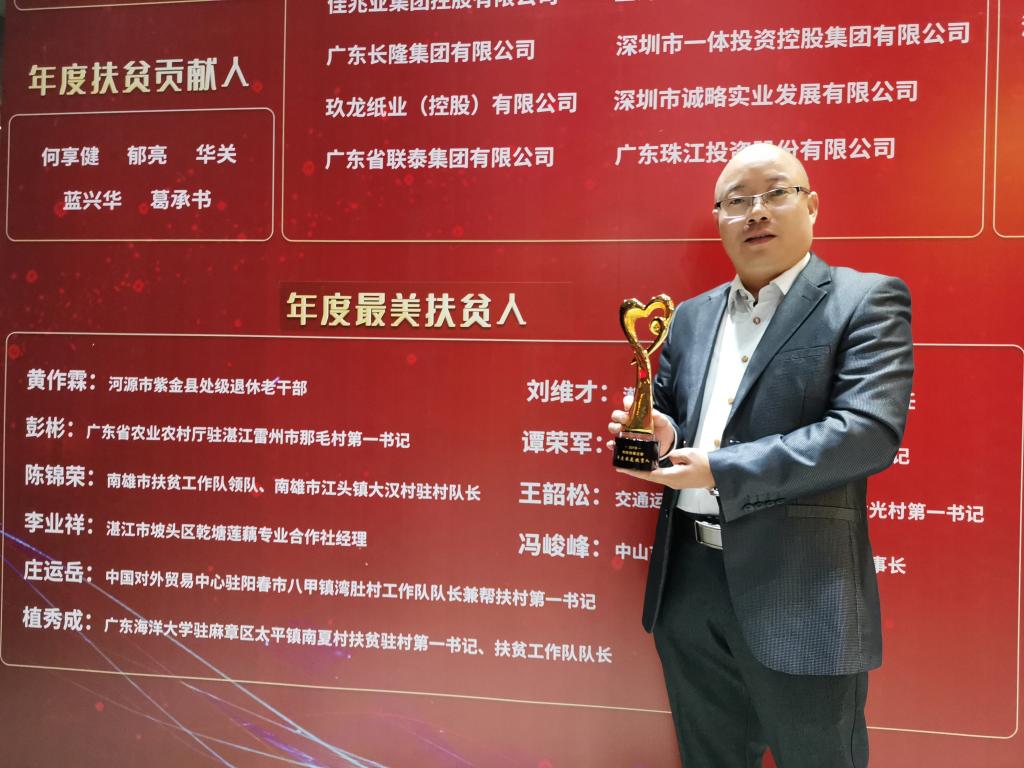 為全面展示廣東脫貧攻堅成效,近日,“2019南粵慈善之夜”活動在廣州舉行。我校駐湛江市麻章區(qū)太平鎮(zhèn)南夏村扶貧干部植秀成獲評“2019南粵慈善之夜年度最美扶貧人”。廣東省農(nóng)業(yè)農(nóng)村廳黨組成員,省委農(nóng)辦、省扶貧辦專職副主任梁健為“年度最美扶貧人”獲獎人員頒獎。