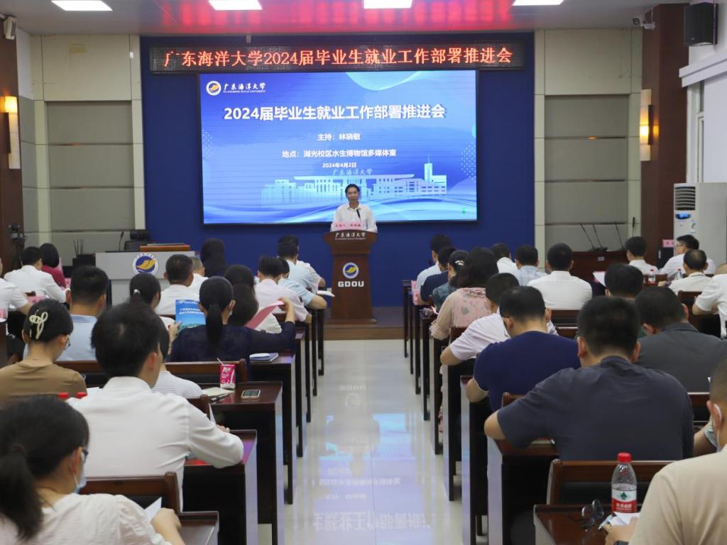 為落實教育部、省教育廳對高校畢業生就業工作的決策部署,增強新形勢下畢業生就業工作的責任感和緊迫感,以更加積極務實的態度推動就業工作提質增效,全力促進畢業生更加充分更高質量就業,我校于2024年4月2日在湖光校區水生生物博物館多媒體室舉行了“廣東海洋大學2024屆畢業生就業工作部署推進會”。學生工作部負責人、各二級學院分管學生工作領導、陽江校區學生事務部負責人、就業科全體人員和負責2024屆畢業生就業工作輔導員共70余人參加了會議。會議由學校黨委副書記林曉敏主持。
