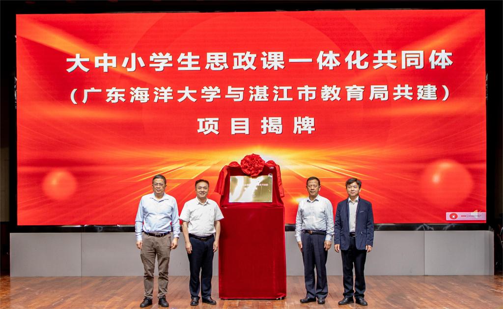 會上,參會領導為廣東海洋大學與湛江市教育局共建的大中小學思政課一體化共同體項目揭牌。