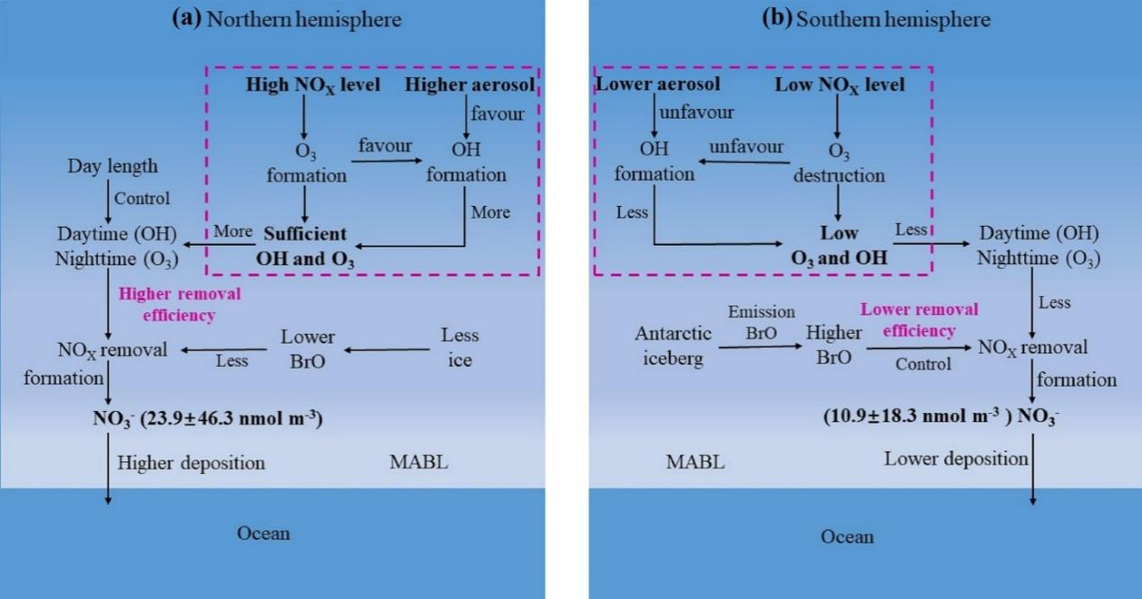 圖1.南半球和北半球海洋大氣硝酸鹽形成機制