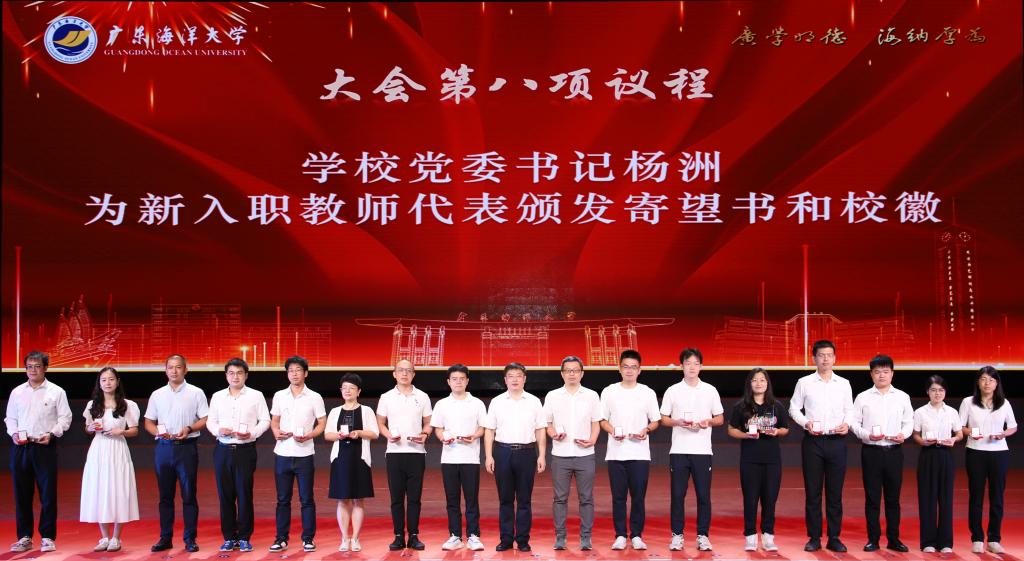 學校黨委書記楊洲為新入職教師代表頒發(fā)寄望書和校徽