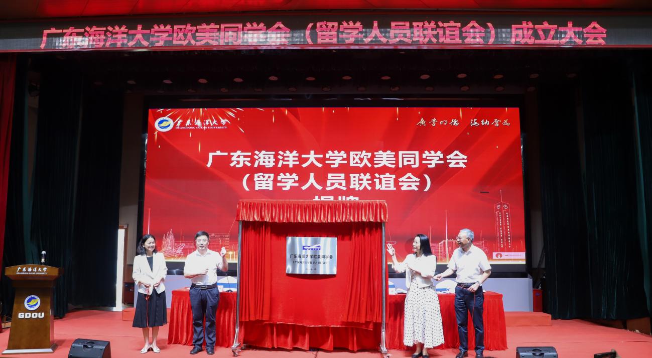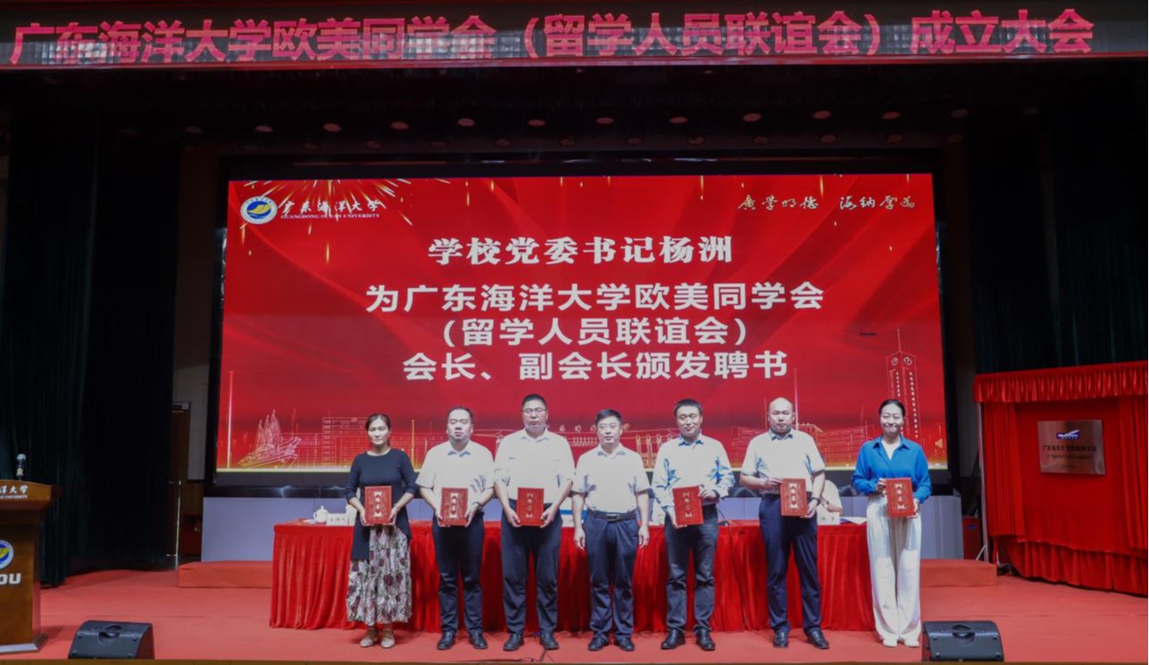 大會現場,與會領導嘉賓共同為廣東海洋大學歐美同學會(廣東海洋大學留學人員聯誼會)揭牌。楊洲為學校歐美同學會新任理事會會長、副會長頒發聘書。