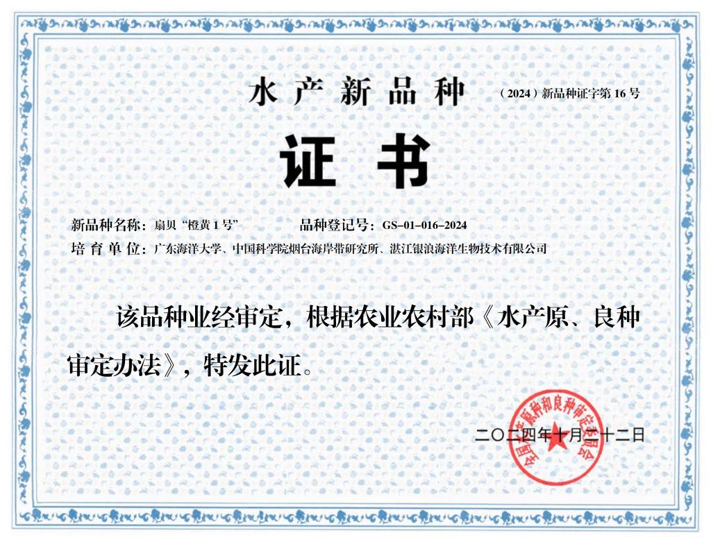 我校扇貝“橙黃1號”榮獲水產(chǎn)新品種