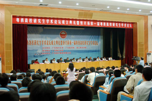 5月21日上午,粵西高校研究生學(xué)術(shù)論壇成立典禮暨恒興杯第一屆粵西高校研究生學(xué)術(shù)論壇在我校主校區(qū)教學(xué)主樓多功能廳舉行。廣東醫(yī)學(xué)院副院長(zhǎng)鄭學(xué)寶、湛江師范學(xué)院副院長(zhǎng)劉海濤、我校副校長(zhǎng)吳灶和、湛江市政府副秘書長(zhǎng)張世輝、廣東恒興集團(tuán)副總裁蔣洪斌等出席典禮并為論壇成立剪彩。出席成立典禮的來賓還有市科技局、團(tuán)市委及市科協(xié)等有關(guān)部門負(fù)責(zé)人。會(huì)議由研究生處處長(zhǎng)于莉主持,吳灶和副校長(zhǎng)致開幕詞。