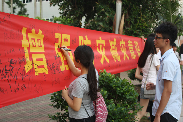 本次校園防災減災宣傳教育活動以“加強防災減災工作,構建平安和諧校園”為主題,以“橫幅簽名”和“圖片展覽”兩種形式向廣大學生宣傳普及防災減災相關知識,全校500余名學生參與現場活動。