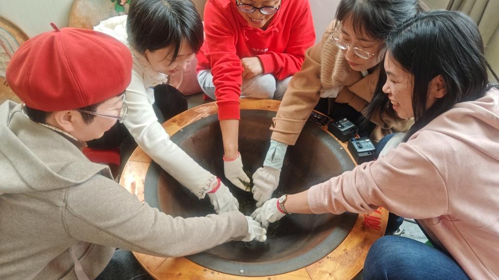 教職工們走進茗上茗茶園,實地了解茶葉的種植、采摘標準以及綠色農業發展模式,并親身參與采茶、制茶實踐。在茶農的悉心指導下,大家親身體驗了攤青、揉捻、烘焙等傳統制茶工序,深刻感受到匠心技藝的獨特魅力。