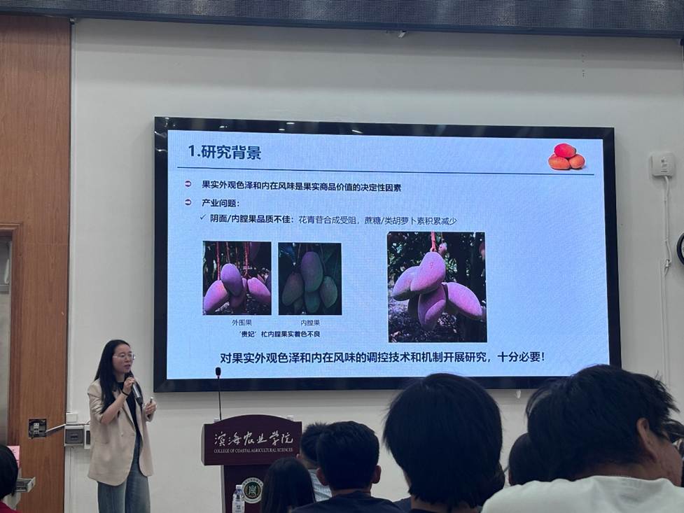 報告會上,錢敏杰以《光調控園藝作物品質的生理及分子機制》為題,詳細介紹了不同紫外光對黃瓜的生長、梨和杧果果實的外觀著色及品質的影響。倪雋蓓以《光和激素調控梨和杧果果實品質形成的分子機制》為題,重點分享了乙烯和藍光通過調控ERF與MYB轉錄因子參與杧果的著色及果實類胡蘿卜素的合成。兩個報告均圍繞園藝植物的外觀品質,結合分子生物學手段,通過案例式剖析,闡明其內在的作用機制,內容豐富,深入淺出。在互動環節,現場師生就自己關心的問題與報告人進行了交流。