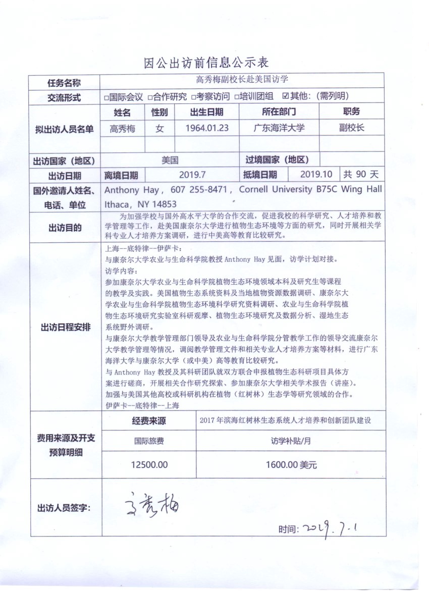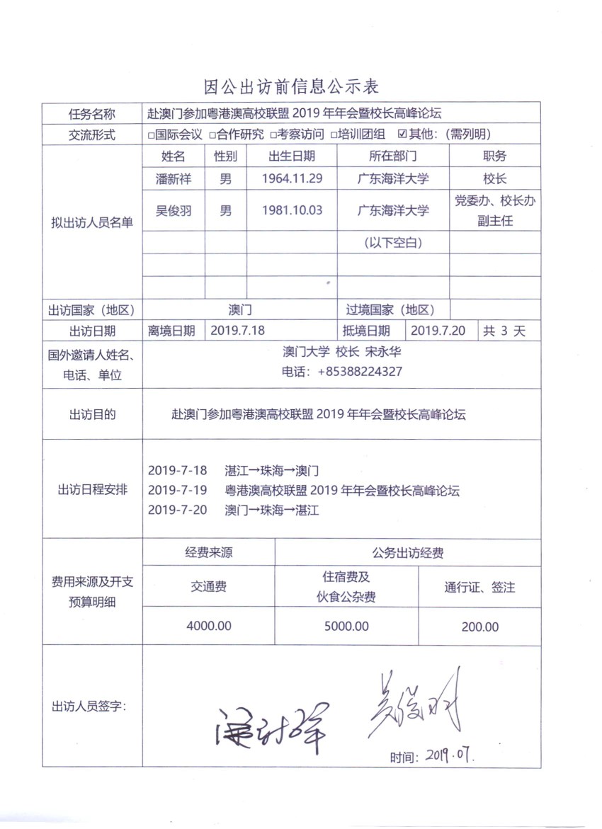 根據(jù)《關(guān)于進一步規(guī)范省部級以下國家工作人員因公臨時出國的意見》的要求,現(xiàn)將廣東海洋大學因公出訪信息予以公示。公示時間為2019年07月11日至7月17日。如有意見,請在公示期內(nèi),向相關(guān)單位反映。(國際交流與合作處電話:0759-2396206;紀委辦電話:0759-2383501)