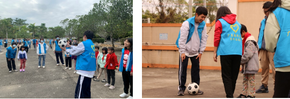 接下來便是戶外小游戲環節,志愿者根據不同年級學生的特點,安排了不同的活動。低年級的小朋友一起玩老鷹抓小雞游戲,高年級的小朋友組織了足球教學,包括理論教學與實踐。