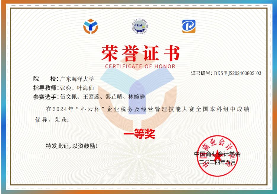 5月25日,由中國(guó)商業(yè)會(huì)計(jì)學(xué)會(huì)主辦的2024年“科云杯”企業(yè)稅務(wù)及經(jīng)營(yíng)管理技能大賽成功舉辦,來(lái)自全國(guó)31個(gè)省、自治區(qū)、直轄市的800多支隊(duì)伍參加了比賽,由我校商學(xué)院會(huì)計(jì)學(xué)專(zhuān)業(yè)張奕、葉海仙老師指導(dǎo)的兩支團(tuán)隊(duì)在此次本科組比賽中榮獲獎(jiǎng)項(xiàng),其中,商學(xué)院2022級(jí)會(huì)計(jì)專(zhuān)業(yè)伍文佩、王嘉蕊、黎芷晴、林婉靜四位同學(xué)獲一等獎(jiǎng),學(xué)位列全國(guó)第9名,榮獲“全國(guó)十強(qiáng)”稱(chēng)號(hào);黃志鴻、陳雯莉、徐雅琪、黃鈺珊四位同學(xué)位列廣東省第8名喜獲二等獎(jiǎng)。