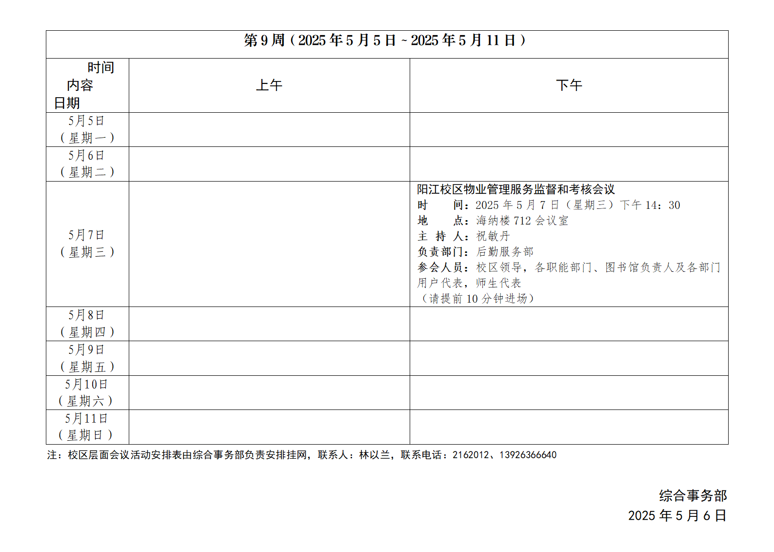 2024~2025學(xué)年第二學(xué)期第10周會(huì)議活動(dòng)安排表