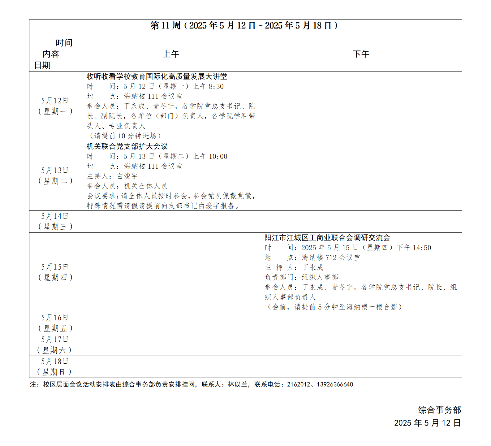 2024~2025學(xué)年第二學(xué)期第11周會(huì)議活動(dòng)安排表