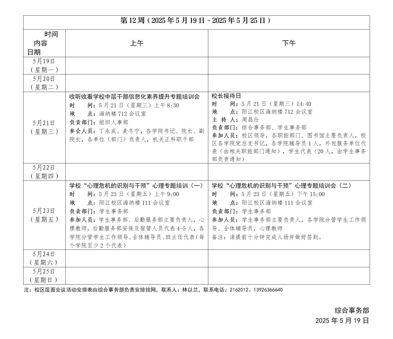 2024~2025學年第二學期第12周會議活動安排表