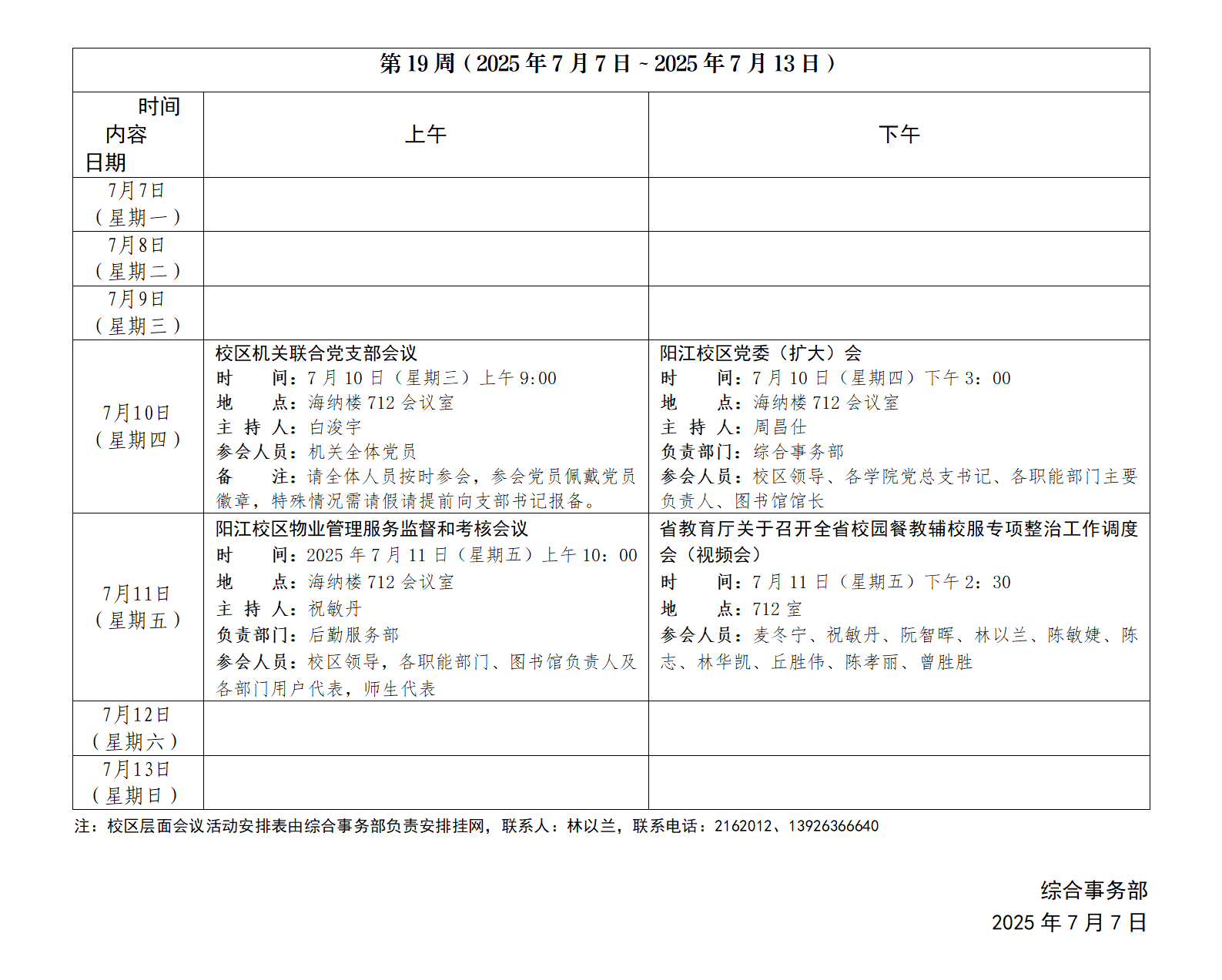 2024~2025學年第一學期第19周會議活動安排表